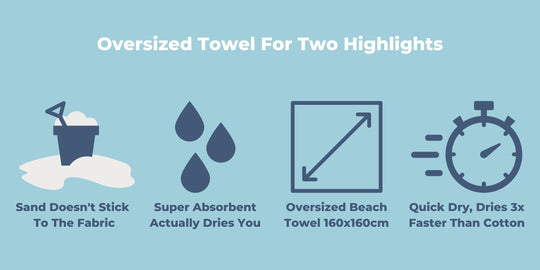 Our oversized beach towel is an extra large 160x160cm and still small enough to roll into the included compact carry bag.